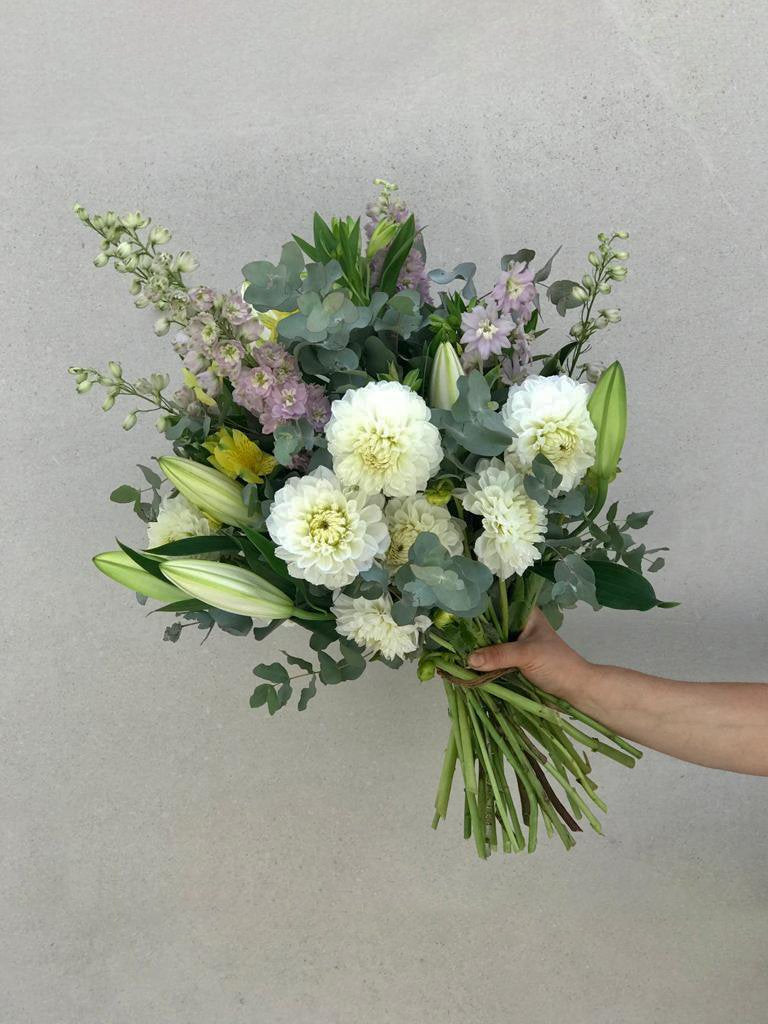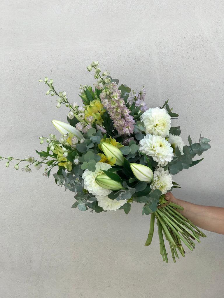 A delicate and soft bouquet, of mixed pastel tones including white.